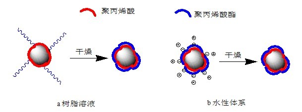 HT A20分子中的錨固部分由(甲基)丙烯酸、磷酸的均聚物或共聚物組成,通過(guò)和鈦白粉間的吸引力(配位作用、共價(jià)鍵)吸附在粒子表面,將粒子隔離開(kāi)來(lái)。和樹(shù)脂相容的穩(wěn)定部分由丙烯酸酯、甲氧基聚丙二醇丙烯酸酯無(wú)規(guī)共聚物組成,賦予表面改性后的鈦白粉粒子良好的再分散性,并且能穩(wěn)定均勻分散在樹(shù)脂溶液和溶劑揮發(fā)后的樹(shù)脂中。在體系干燥過(guò)程中以及干燥后,和樹(shù)脂相容的部分能包覆在鈦白粉粒子表面,防止粒子聚集,使得鈦白粉粒子在樹(shù)脂中能均勻分散。圖2表示改性劑HT A20處理鈦白粉粒子后,HT A20在粒子表面的形態(tài)。圖2a表示在樹(shù)脂溶液或溶劑中,干燥前,改性劑的錨固部分和鈦白粉粒子間通過(guò)共價(jià)鍵、配位鍵結(jié)合在粒子表面上,聚丙烯酸酯部分充分伸展,通過(guò)空間位阻作用穩(wěn)定粒子;干燥后,聚丙烯酸酯部分包覆在粒子上或和樹(shù)脂基體互相滲透。圖2b表示在水性體系中,干燥前,改性劑的聚丙烯酸錨固部分和鈦白粉粒子間通過(guò)共價(jià)鍵、配位鍵結(jié)合在粒子表面上,依靠靜電斥力穩(wěn)定粒子;干燥后,聚丙烯酸酯部分包覆在粒子上或和樹(shù)脂互相滲透??梢?jiàn),雙親型嵌段聚合物改性劑HT A20對(duì)鈦白粉進(jìn)行有機(jī)表面處理后,在有機(jī)溶劑體系和水性體系中,都能提高鈦白粉在介質(zhì)中的分散穩(wěn)定性并改善鈦白粉和樹(shù)脂的相容性。